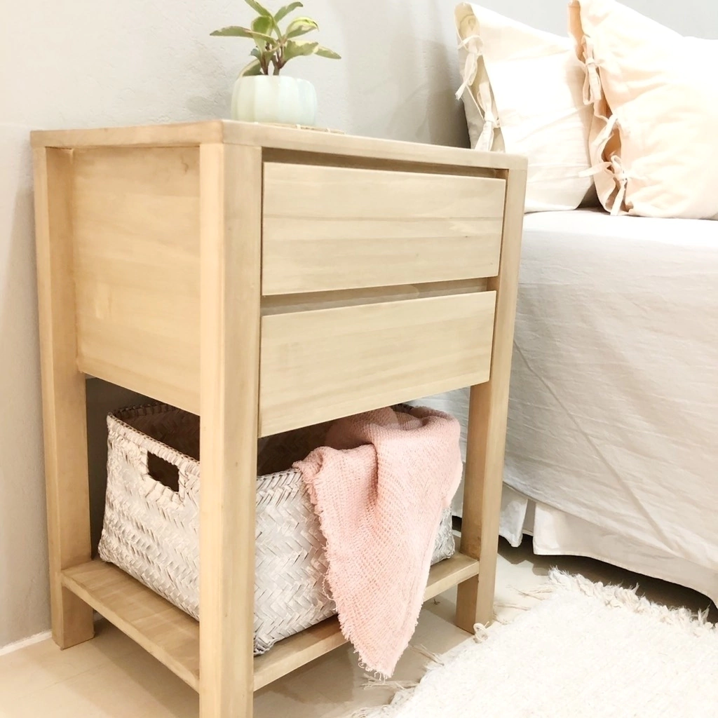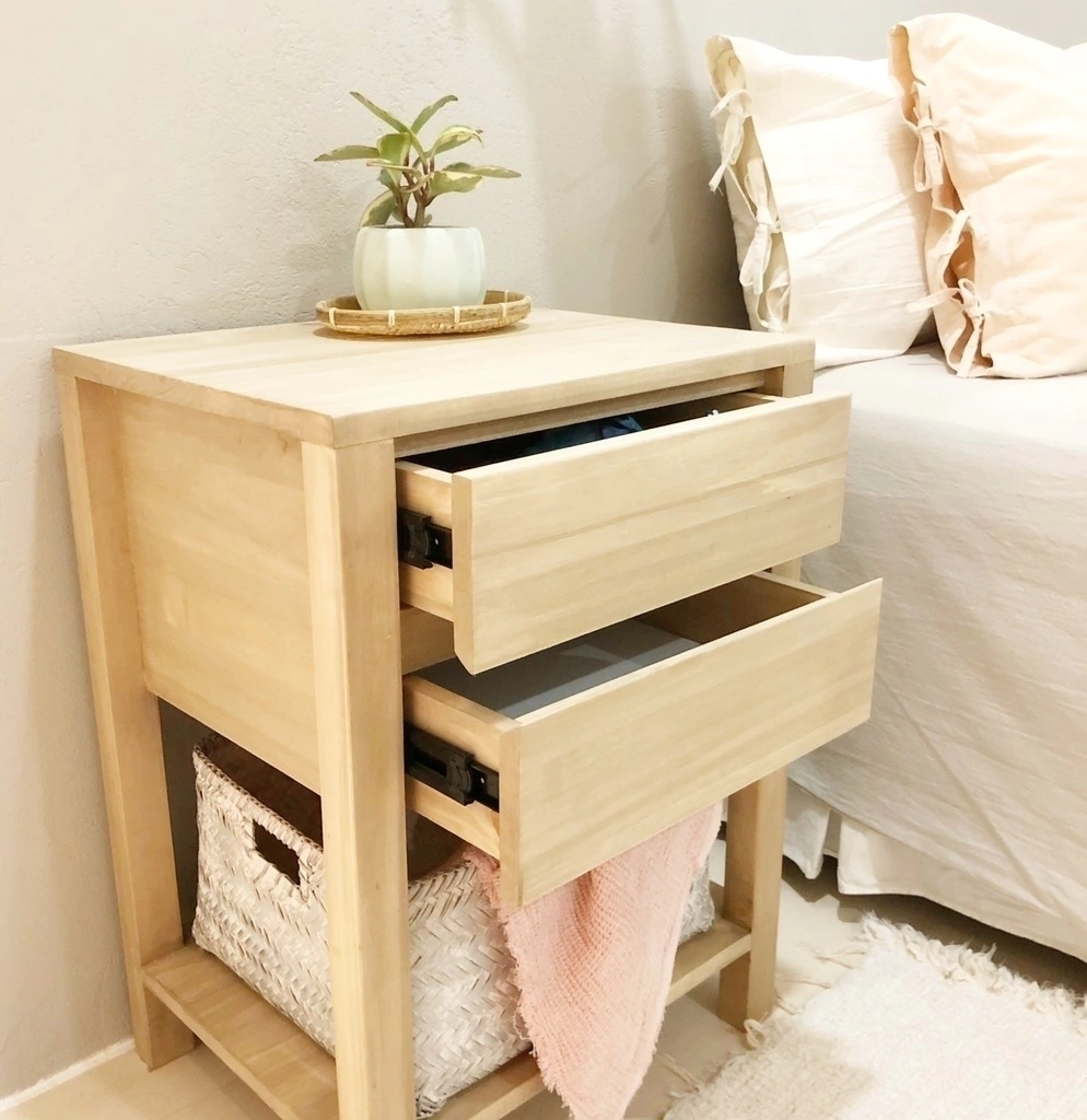 Mesa de luz realizada en madera de Álamo teñido con uno o dos cajones, guías telescópicas y un estante inferior.